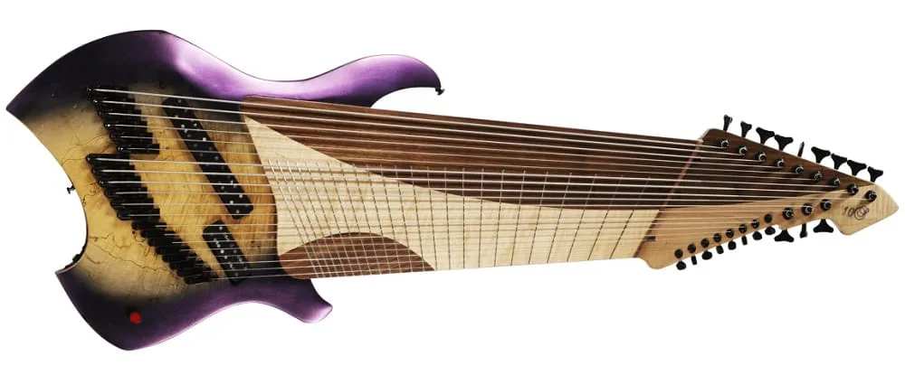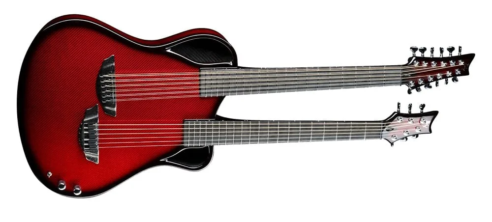 Another unique model from a custom carbon fiber Guitar, the Synergy X20, is not a pure guitar. It’s called a harp guitar. It has one traditional guitar neck and another curved one that works as a harp with six set strings and no frets.